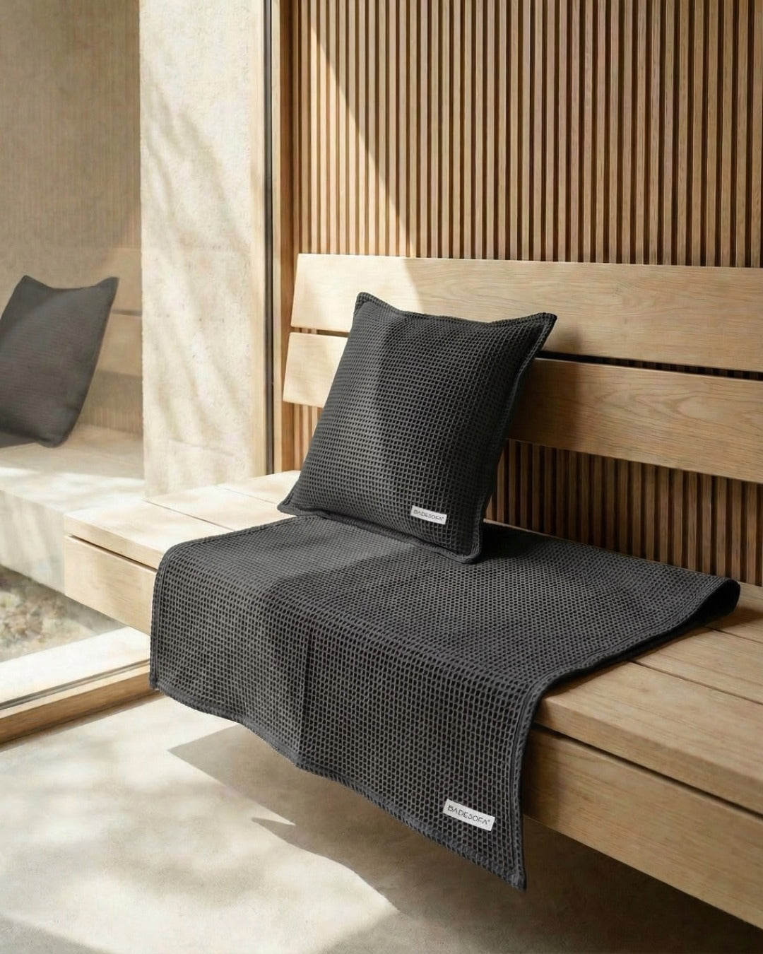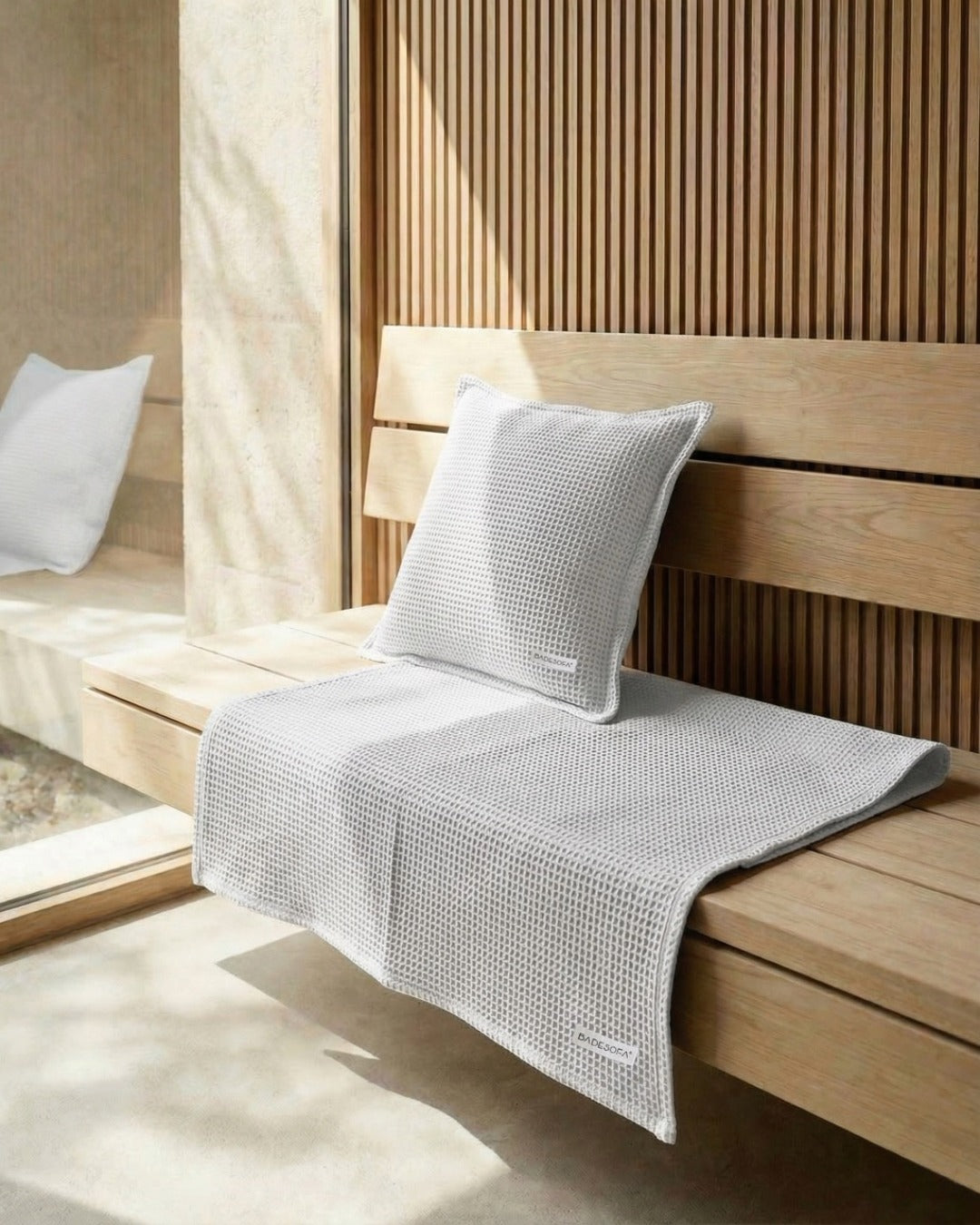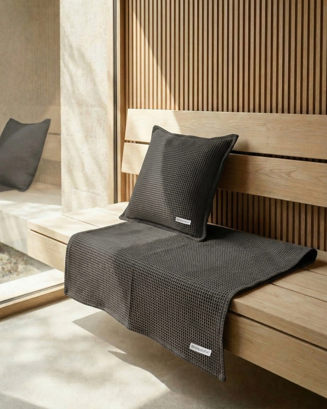 SAUNASOFA Kissen - Nie hast Du in der Sauna so bequem mit Deinem Kopf gelegen und die Entspannung genossen. Kombiniere Kissen und Badetuch passend und genieße deinen Wellness-Tag.