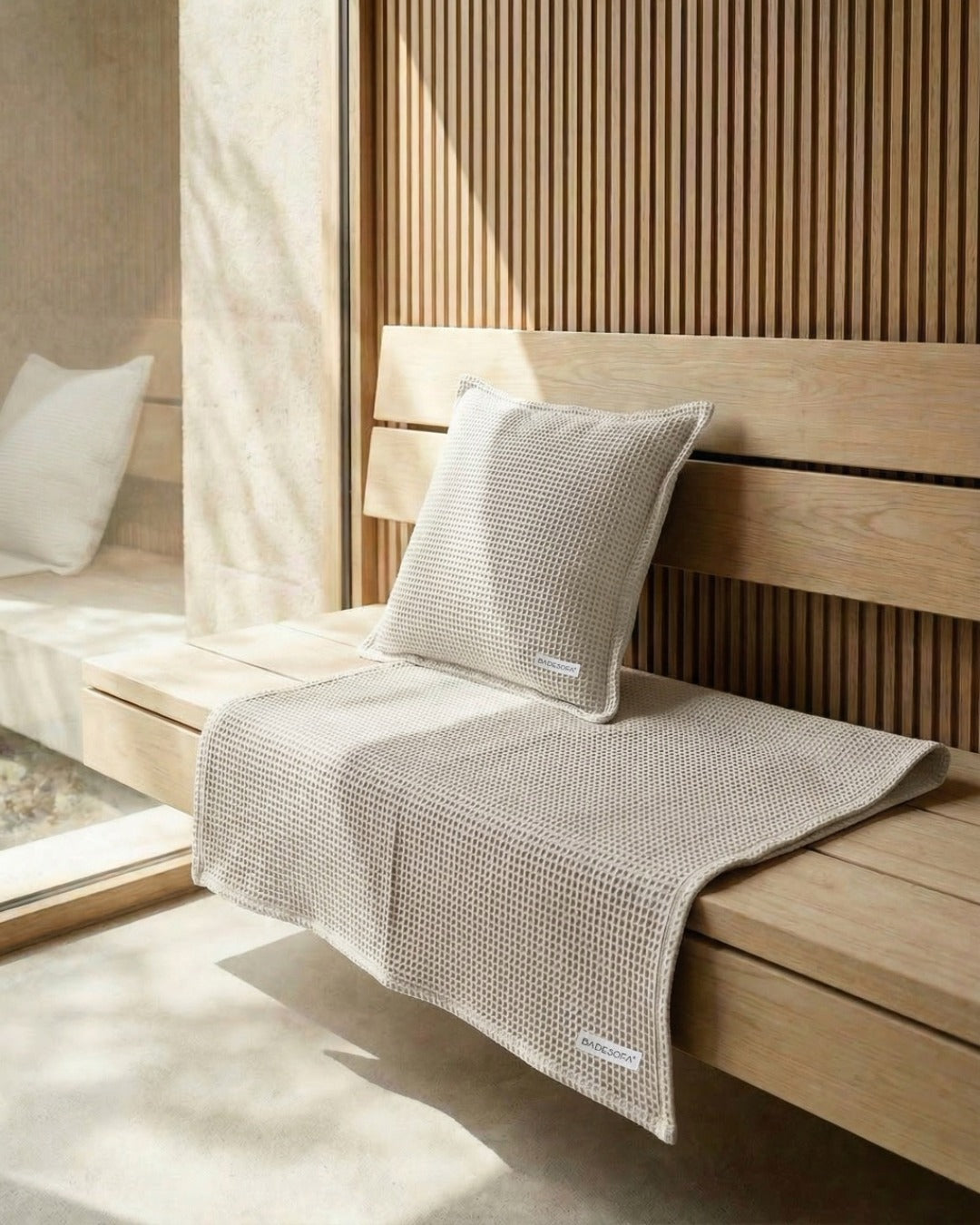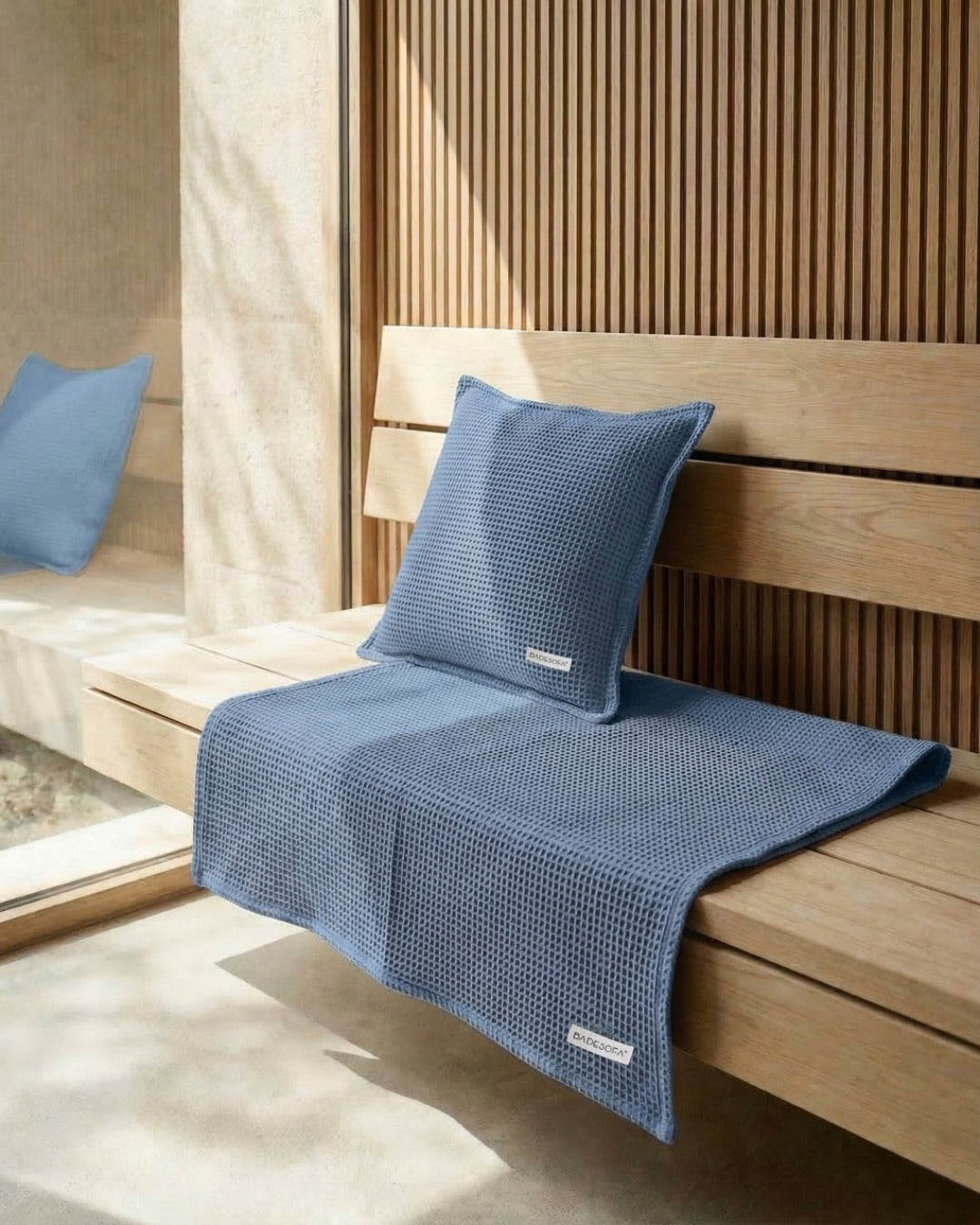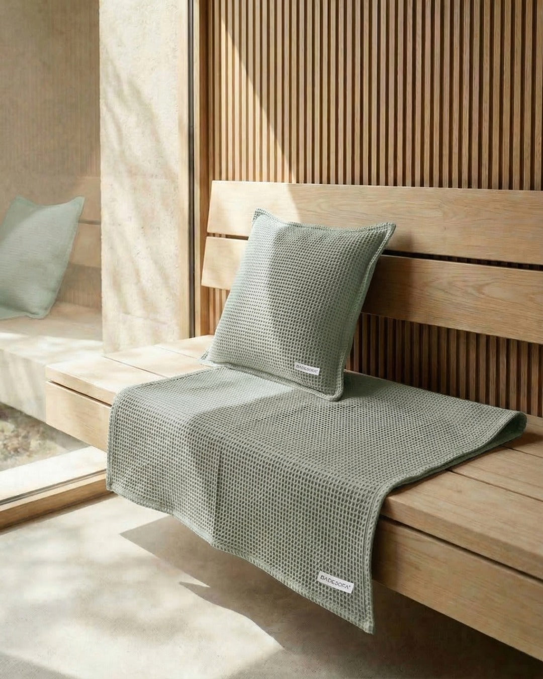 SAUNASOFA Kissen - Nie hast Du in der Sauna so bequem mit Deinem Kopf gelegen und die Entspannung genossen. Kombiniere Kissen und Badetuch passend und genieße deinen Wellness-Tag.